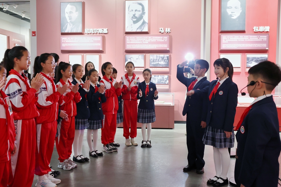 “大家看,这是《共产党宣言》第一个中文全译本,当年印刷时曾将书名误印为‘共党产宣言’……”展柜前,卢湾一中心小学的红领巾讲解员指着文物娓娓道来,嘉兴的小伙伴凝神细听。