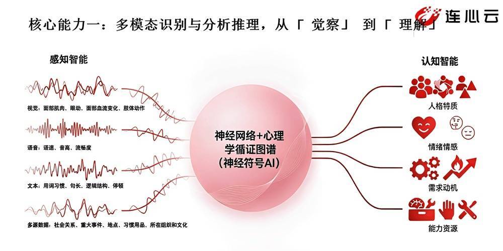 基于心理学与AI结合的逻辑,连信数字自研推出了“洞见人和”人本世界(心理)大模型,这是全国首个通过国家双备案的心理应用垂类大模型。它具备两大能力:多模态识别与分析推理,以及可将心理洞察转化为业务洞察。