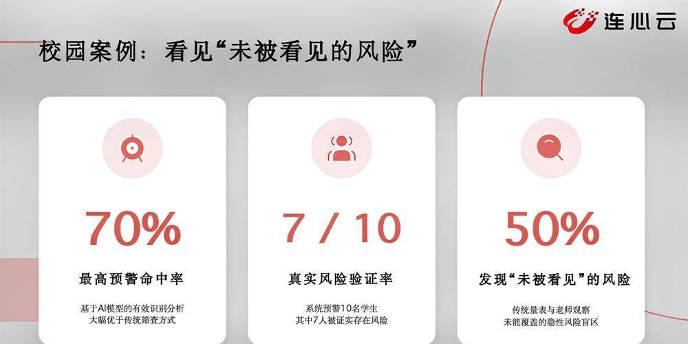 教育案例:我们为多所学校提供了心理健康异常风险预警模型。学校将该模型接入安防系统,通过走廊、食堂等场所的监控摄像头采集学生每天的情绪和行为。经过一段时间的监测,模型可以识别每个孩子的情绪异常波动、攻击性、压力过载等情况,并在出现异常时向老师预警。其中一所深度合作的校方反馈,预警的10人中,有6人确实存在明显的心理困扰。其中一名学生曾因心理问题退学,复学后适应不良,本人没有告诉老师,但被模型捕捉到了。此外,超过一半学生的心理危机甚至是此前老师没有关注到的——例如遭受霸凌、被孤立、与朋友吵架等。我们预警的不是“孩子马上要跳楼”这样的极端信号,而是那些真正会影响危险事件发生的“前置信号”,从而把风险防范于未然。