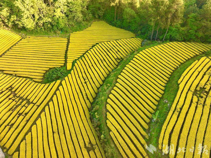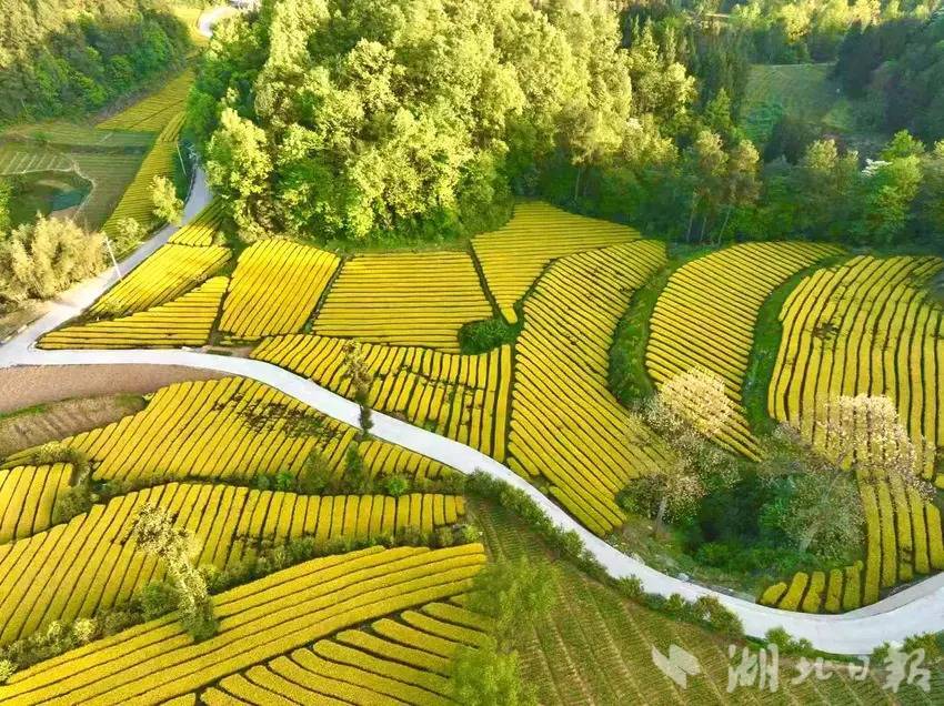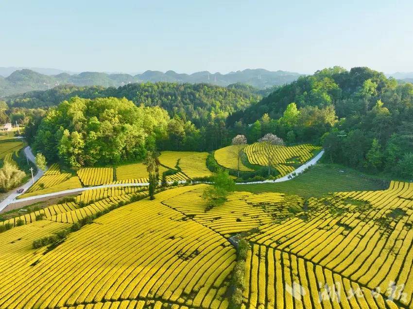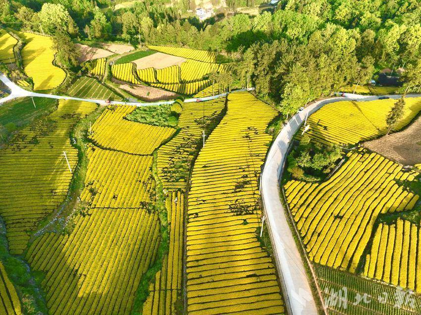 4月25日,咸丰县清坪镇绵羊洞村千亩黄茶泛金光。(湖北日报客户端通讯员 黄锋 秦雪芳 摄)