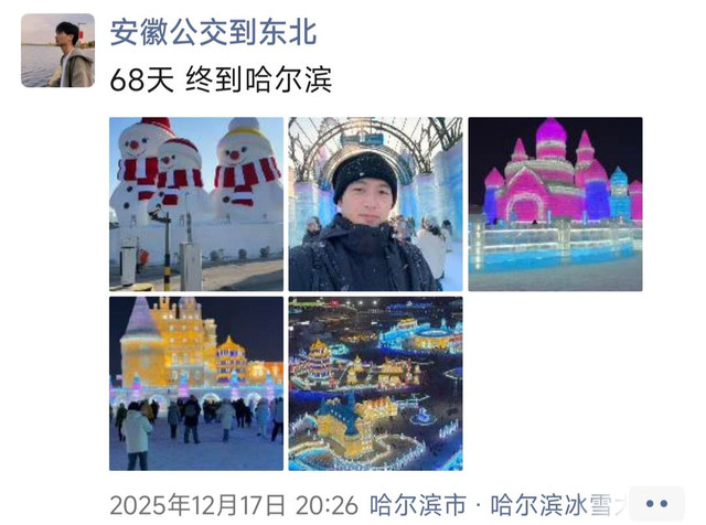 此前68天时间,他用一场公交车旅行,从安徽出发,跨越25座城市,到达“冰雪之国”。但,一直未遇下雪。